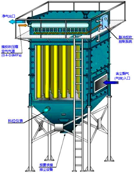 工作时,含尘气体由进风道进入灰斗,粗尘粒直接落入灰斗底部,细尘粒随气流转折向上进入中、下箱体,粉尘积附在滤袋外表面,过滤后 的气体进入上箱体至净气集合管-排风道,经排风机排至大气 。 清灰过程是先切断该室的净气出口风道,使该室的布袋处于无气流通过的状态(分室停风清灰)。然后开启脉冲阀用压缩空气进行脉冲喷吹清灰,切断阀关闭时间足以保证在喷吹后从滤袋上剥离的粉尘沉降至灰斗,避免了粉尘在脱离滤袋表面后又随气流附集到相邻滤袋表面的现象,使滤袋清灰彻底,并由可编程序脉冲控制仪对排气阀、脉冲阀及卸灰阀等进行全自动控制。