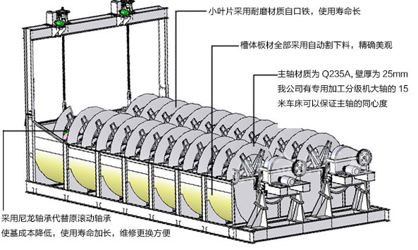 该机下部支座采用活轴套、尼龙轴瓦结构,维修更换方便;底座采用槽钢,机体采用钢板焊接而成;螺旋轴的入水头、轴头,采用生铁套,耐磨耐用。